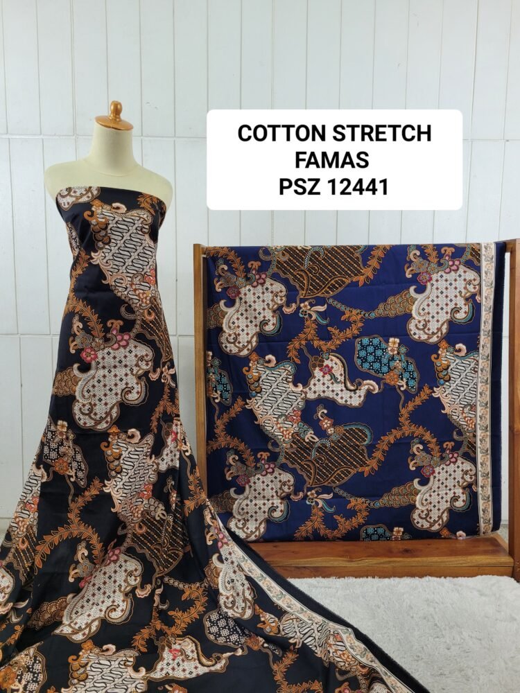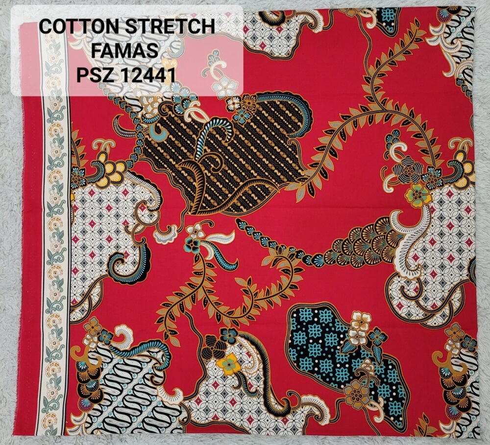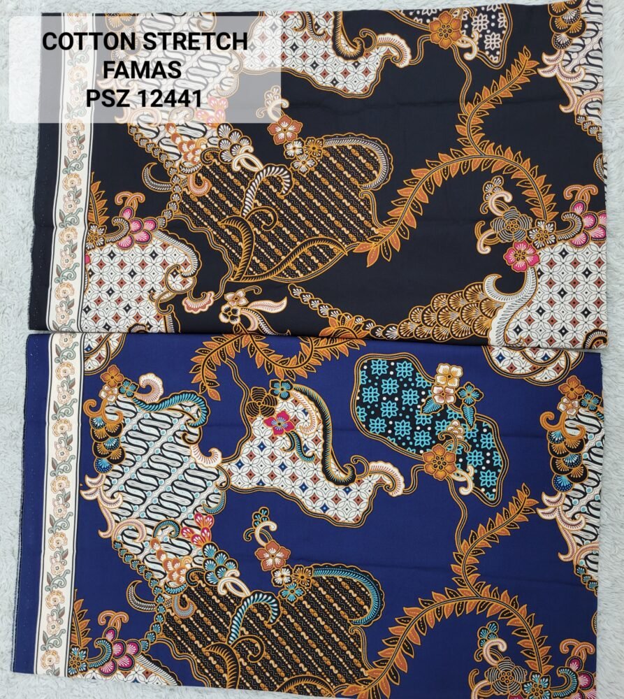 Kain printing yang dicetak dibahan dasar cotton stretch. Terbuat dari 100% kapas berkualitas beranyaman plat, dengan tambahan spandex. Memberikan efek elastis.