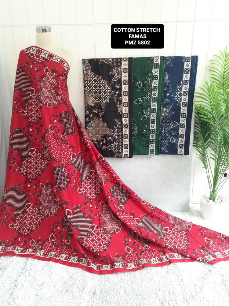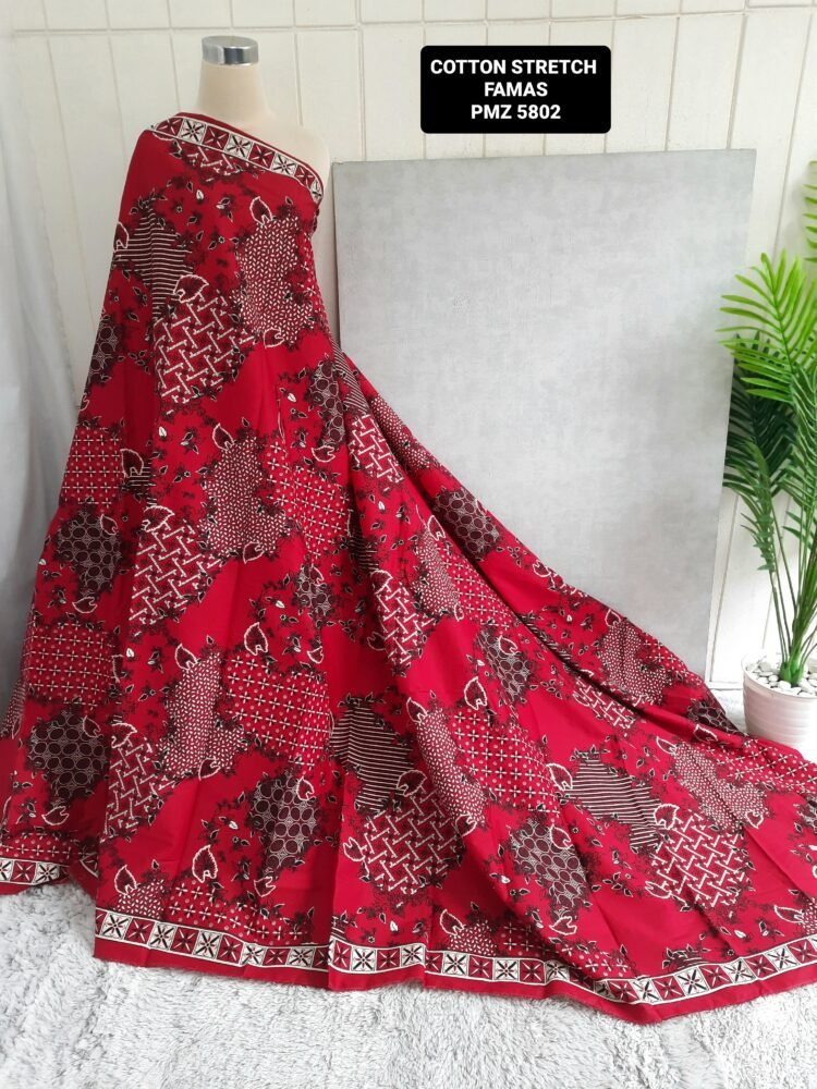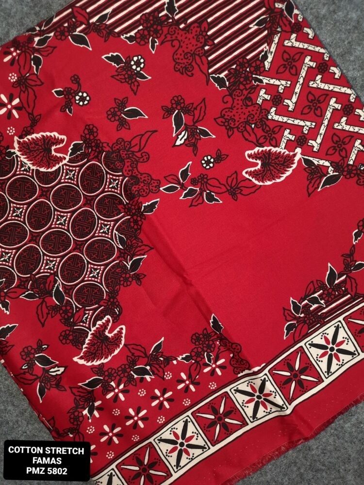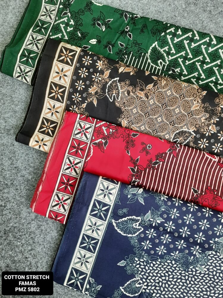 Kain printing yang dicetak dibahan dasar cotton stretch. Terbuat dari 100% kapas berkualitas beranyaman plat, dengan tambahan spandex. Memberikan efek elastis.