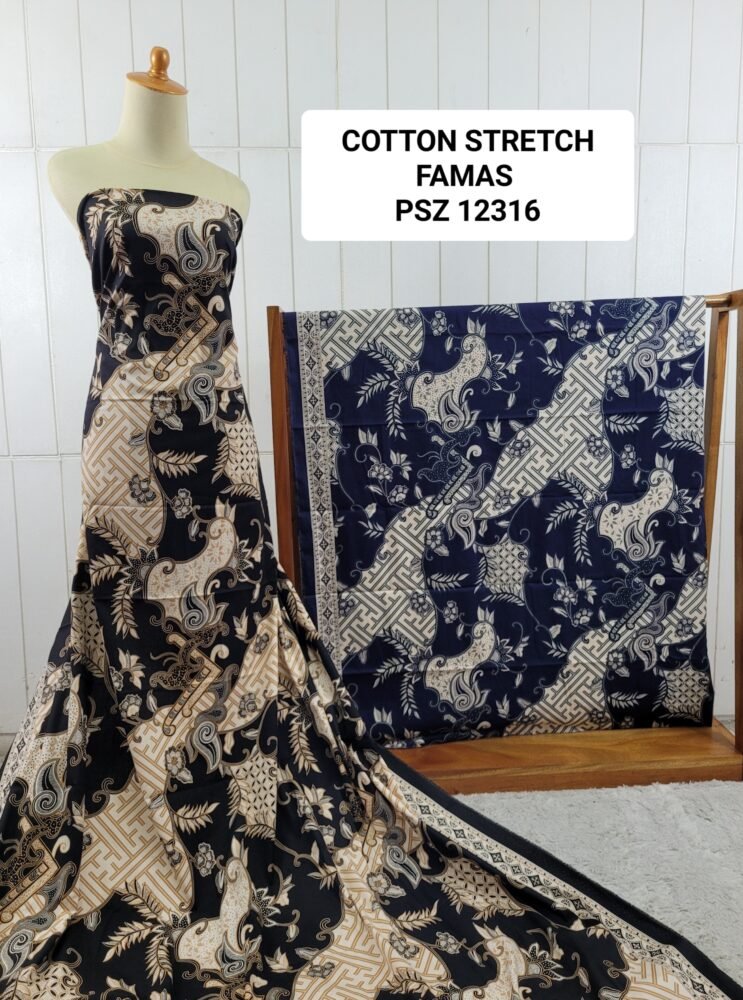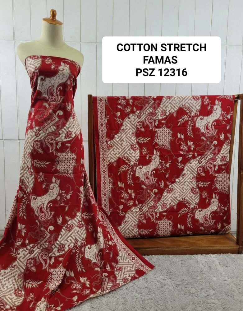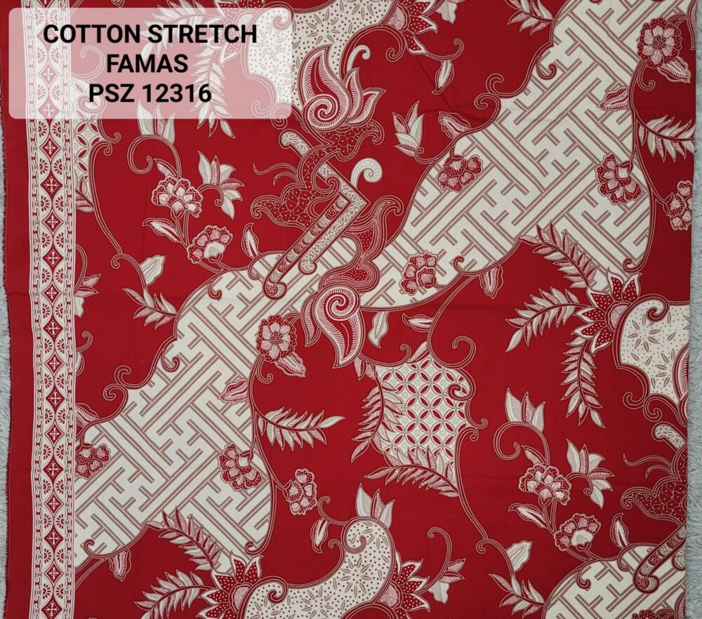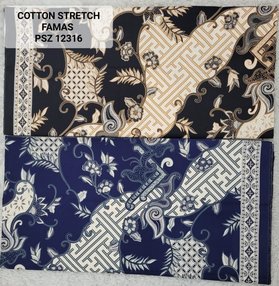 Kain printing yang dicetak dibahan dasar cotton stretch. Terbuat dari 100% kapas berkualitas beranyaman plat, dengan tambahan spandex. Memberikan efek elastis.