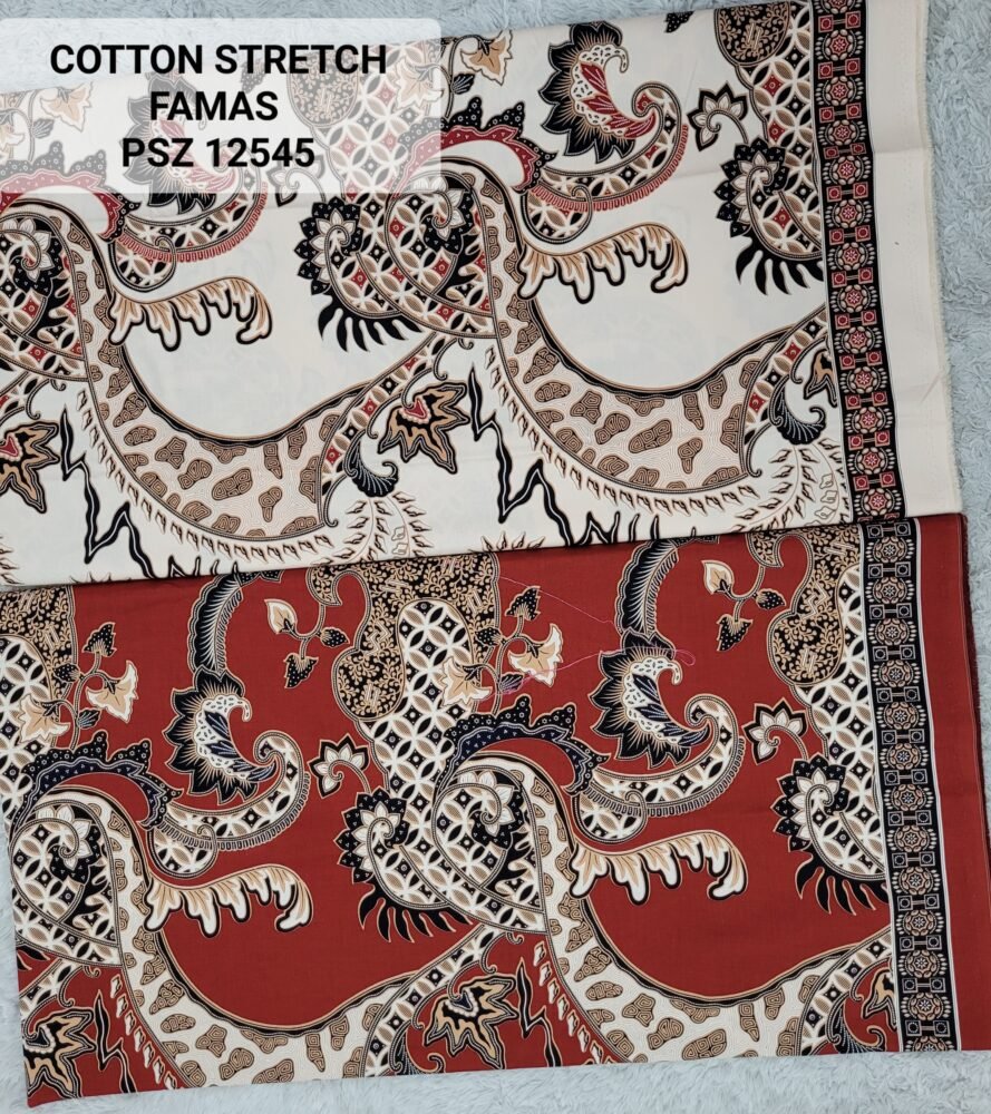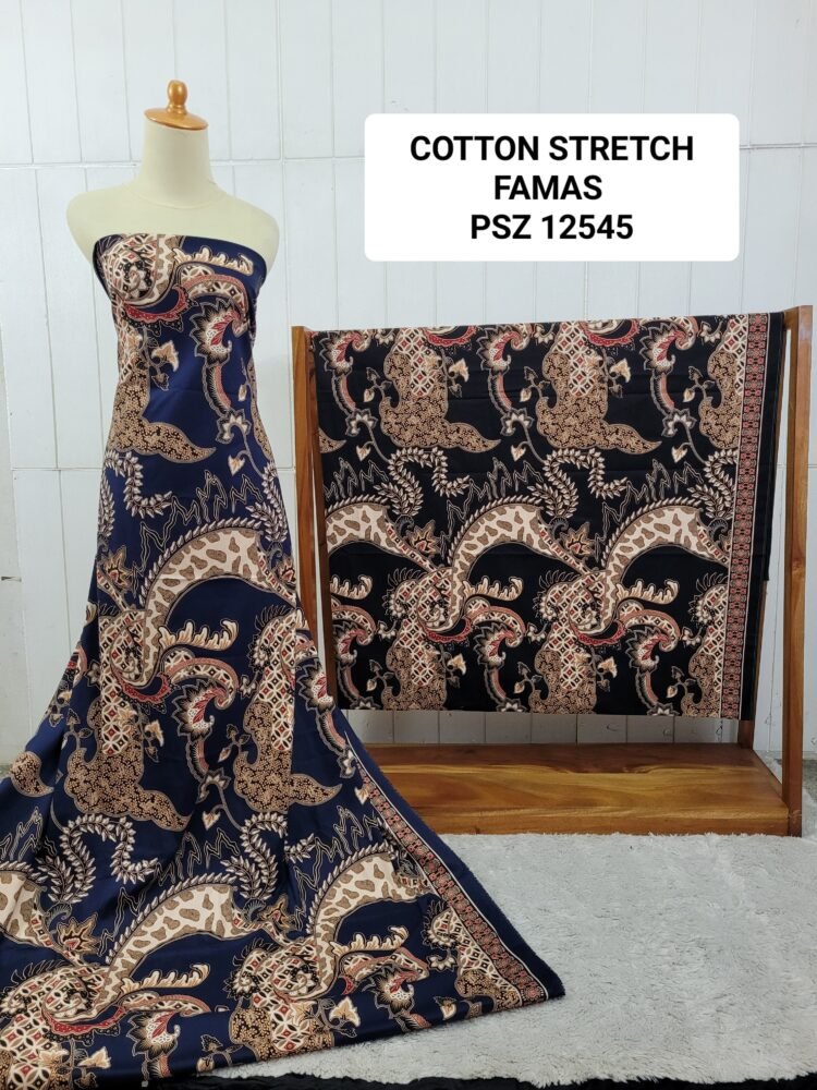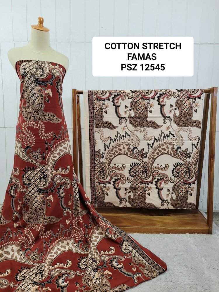 Kain printing yang dicetak dibahan dasar cotton stretch. Terbuat dari 100% kapas berkualitas beranyaman plat, dengan tambahan spandex. Memberikan efek elastis.