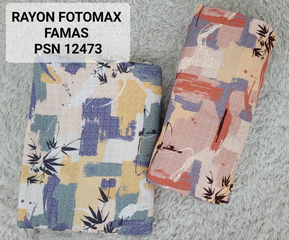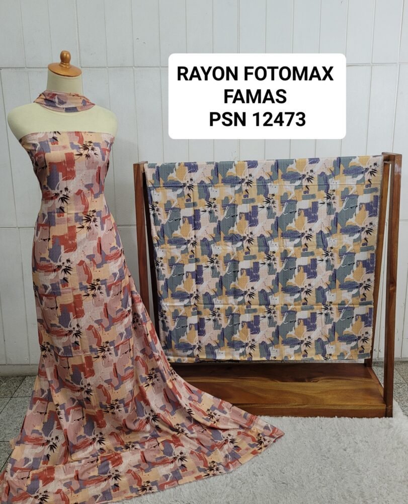 Kain printing yang dicetak di bahan dasar rayon Fotomax yang merupakan bahan selulosa murni. Karena terbuat dari 100% serat alami, sehingga bahan rayon printing ini terasa nyaman dipakai, adem dan halus.